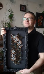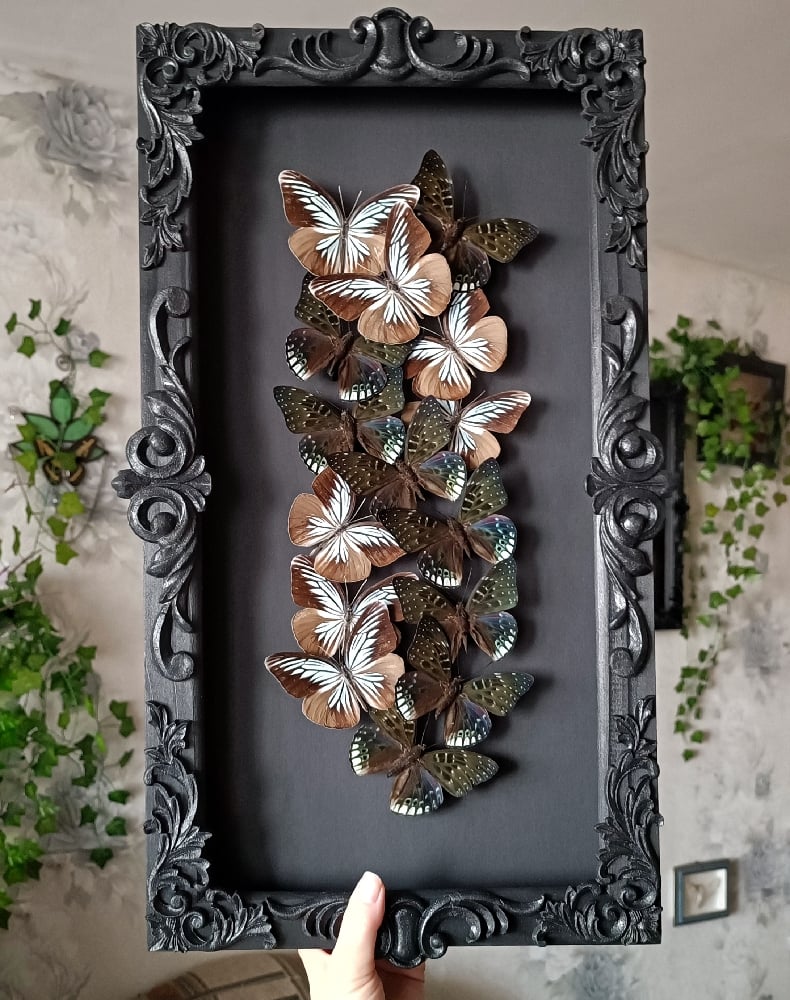 This artwork features following butterflies specimens: White Edged Constable (Dichorragia ninus), Blue Wanderer (Pareronia tritaea).