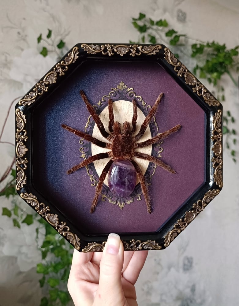 It is 100% handmade work that includes preserved spider, frame, painting. This frame is unique and sold as a single copy.